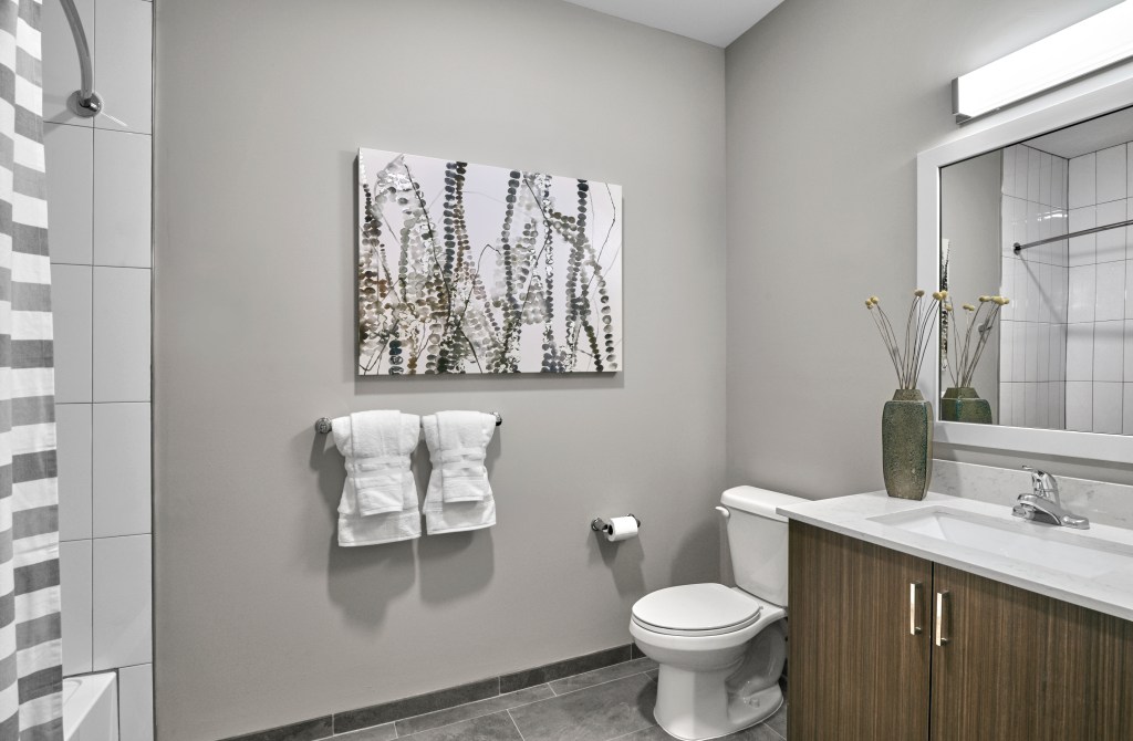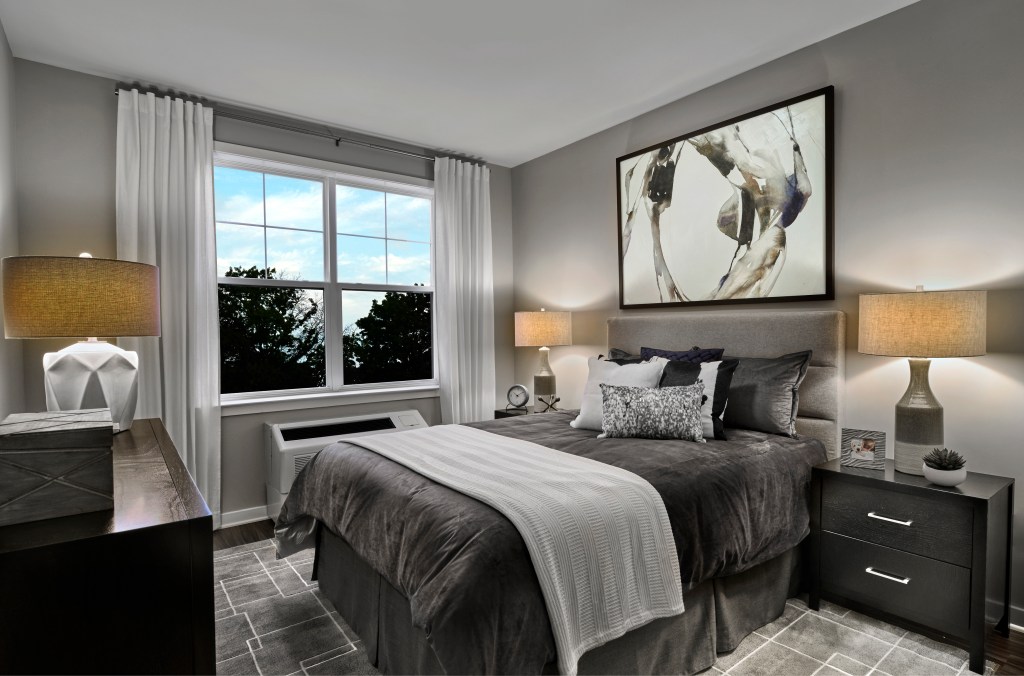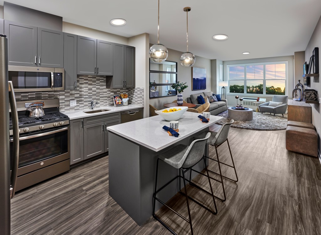 CENTURION UNION is a striking architectural addition to Union Center. Inside, expansive living spaces boast nine-foot ceiling heights, wide wood-style plank flooring, vented in-home washer and dryers by GE, and kitchens with full-size slate GE appliances, gas range stoves, island/peninsula work spaces and quartz countertops. Luxurious baths are equipped with glass-enclosed showers, porcelain tile and polished chrome fixtures.