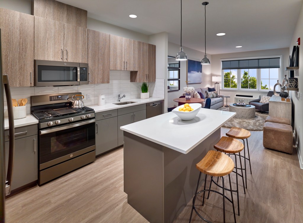 Residences at CENTURION Union Center are lined with designer features and appointments, including nine-foot ceiling heights, wide wood-style plank flooring, vented in-home washer and dryers by GE, and open kitchens with full-size slate GE appliances, gas range stoves, island/peninsula workspaces and quartz countertops. Luxurious baths are equipped with glass-enclosed showers, porcelain tile and polished chrome fixtures.