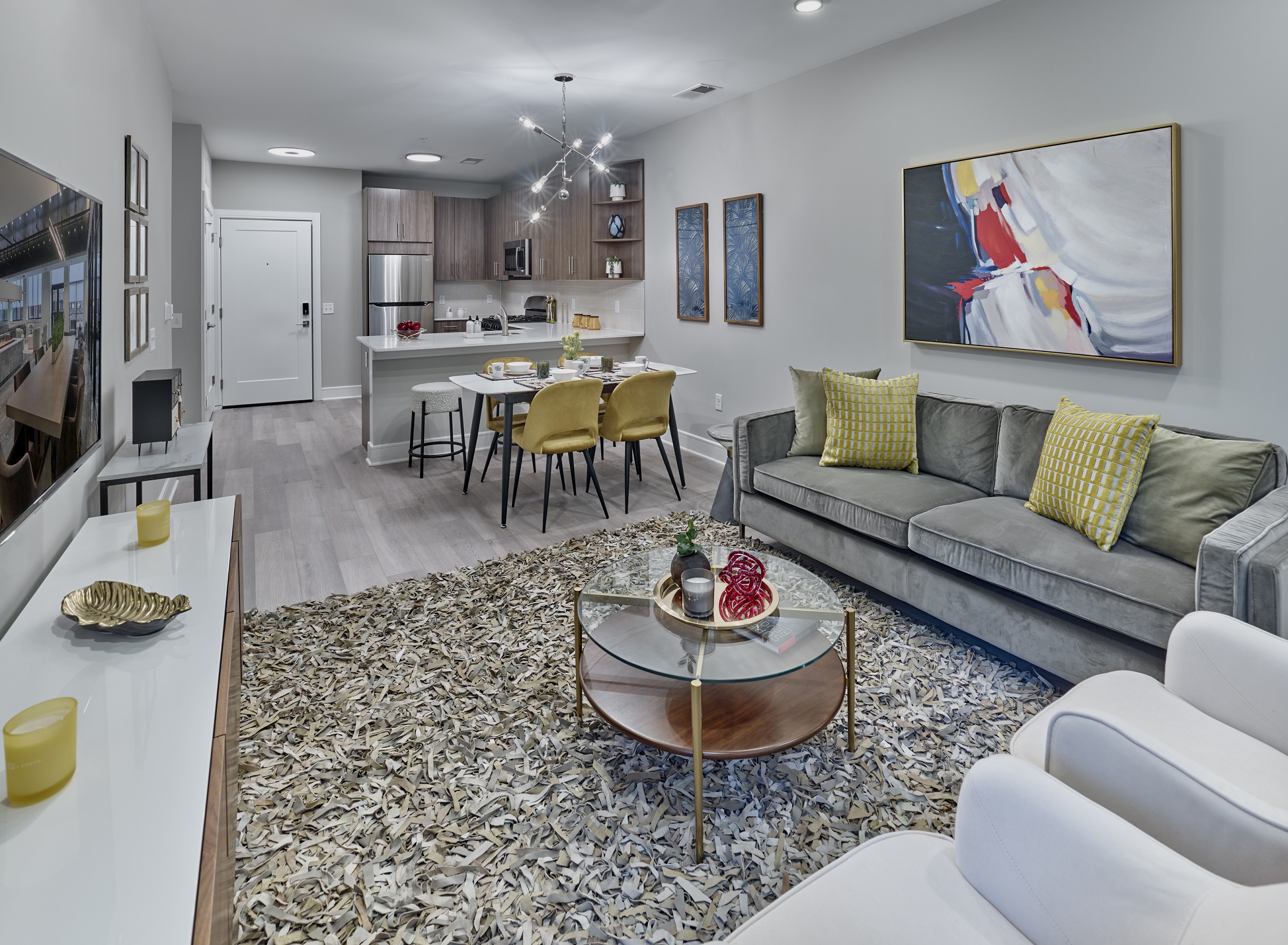 Transit-Oriented Community Features, Upscale Amenities and Modern Interior Spaces in Suburban Downtown Setting