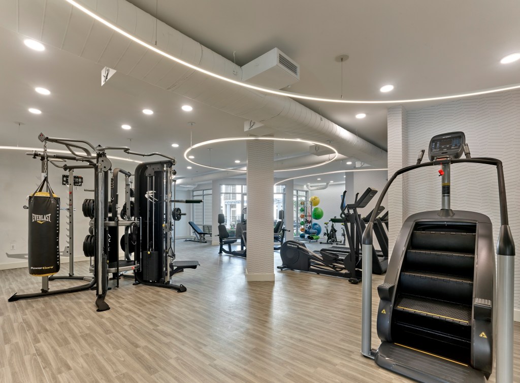 The residences at Crossings are complemented by a full array of amenities and services, including a sophisticated lobby lounge with a coffee bar, a state-of-the-art fitness center with virtual training technology, Amazon® package lockers, private covered parking, a bicycle share, bicycle storage and 24/7 onsite maintenance.