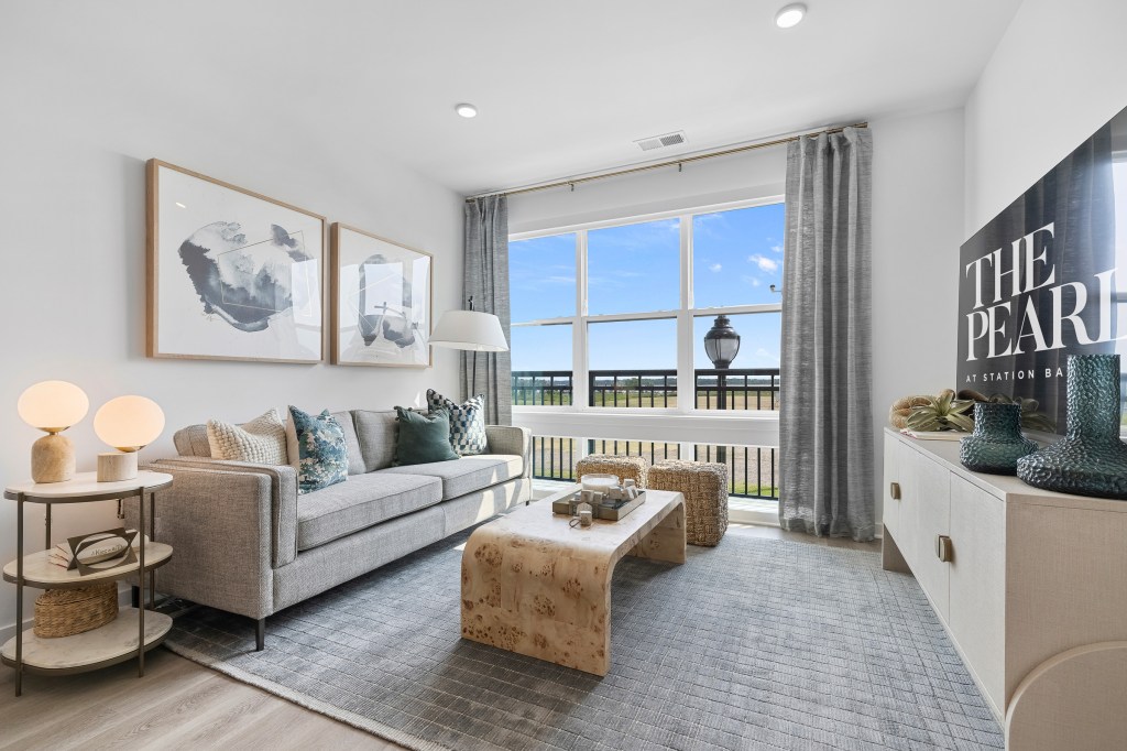 Like all residences at The Pearl at Station Bay, their apartment offers key features such as 9- to 10-foot ceilings, wide-plank flooring, solar window shades, and modular closet systems. Their kitchen includes quartz countertops, modern gray suede cabinetry, full-height tile backsplashes, undercabinet lighting, stainless steel appliances, and a gas range. From the mosaic tiles of the bathroom to the oversized windows that bathe the living room in natural sunlight, they agree that the layout is both functional and stylish.